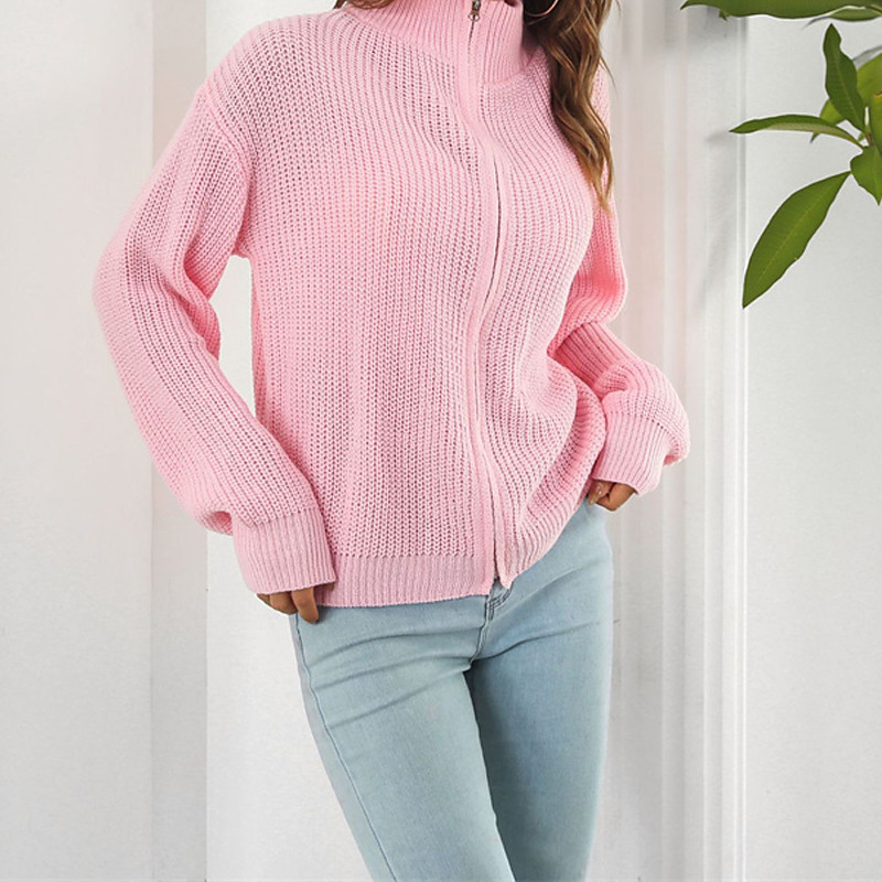 Women's Cardigan Casual Solid Color Chunky Turtleneck Zipper Knitted Long Sleeve Regular Tops Knit Daily Holiday Going out Black Pink Fall Winter