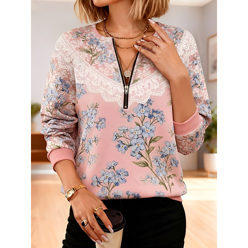 Women's Pullover Sweatshirt Zip Up Sweatshirts Floral Fashion Casual Long Sleeve Crew Neck Regular Tops Street Dailywear Casual Zipper Print Pink Navy Blue Spring Fall Winter