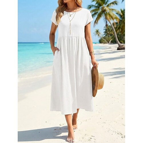 Per donna Abito Midi Finto cotone e lino Abito a Tubino Moda Moderno All'aperto Spiaggia Vacanza Vestibilità comoda Semplice Manica Corta Girocollo Nero Bianco Verde chiaro Rosa Estate Primavera