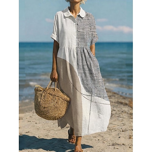Per donna Abito maxi Misto lino Elegante Bohemien Vacanza Ferie Vestibilità comoda Geometrico Manica Corta Colletto a Camicia Grigio Estate Primavera