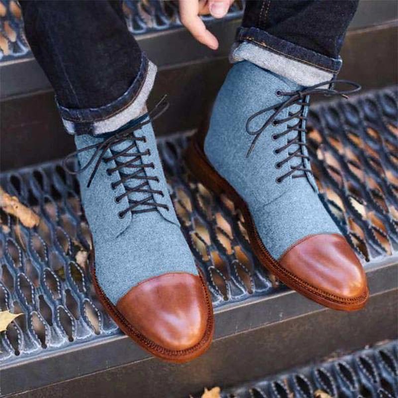 Men's Brown Leather and Denim Lace-Up Boots with Cap Toe and Rugged Sole Stylish Vintage Ankle Boots