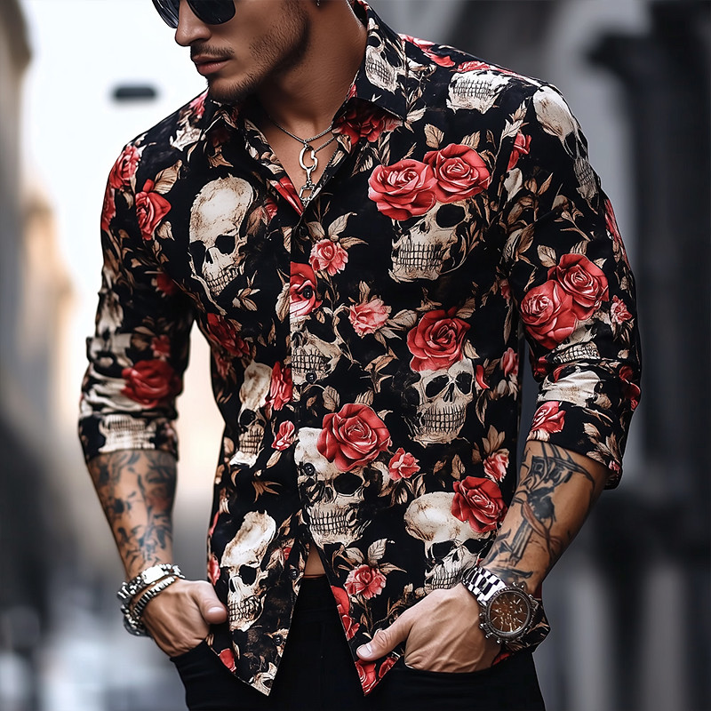 Men's Skull Day of the Dead Rose Shirt Button Up Shirt Casual Dress Shirt Long Sleeve Dark Gothic Style Vacation Daily Streetwear Summer Spring Turndown 3D Print Collared Shirts Black 1 Black