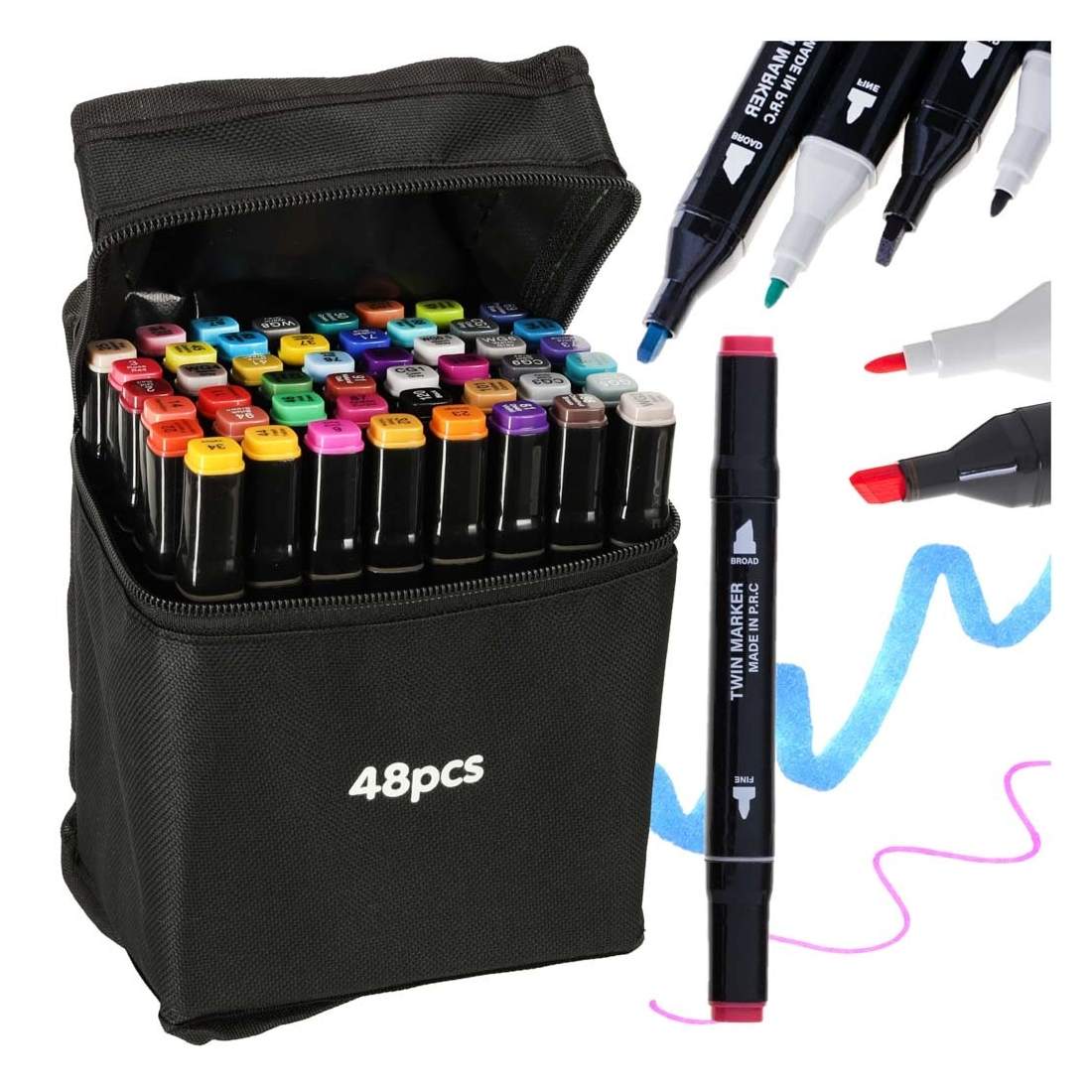 48 alkoholbaserte markører med dobbel spiss, stativ og etui