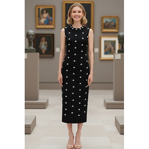 Abito da festa in stile colonna lungo fino al tè abito da cocktail abito per invitati a matrimoni abito per madri della sposa senza maniche collo a girocollo elegante vintage abito nero con perle e