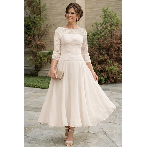 Linea ad A Lunghezza alla caviglia Vestito da Festa Abito da Cocktail Abito da invitata a nozze Abito da cerimonia per signora Manica 3/4 Collo gioiello Elegante Ospite di nozze Chiffon Pizzo con