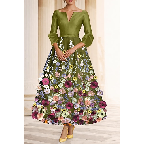 Linea ad A Lunghezza Tè Abiti da Cocktail Elegante Manica 3/4 Scollo a V Festa in giardino Matrimonio Raso con Stampa floreale
