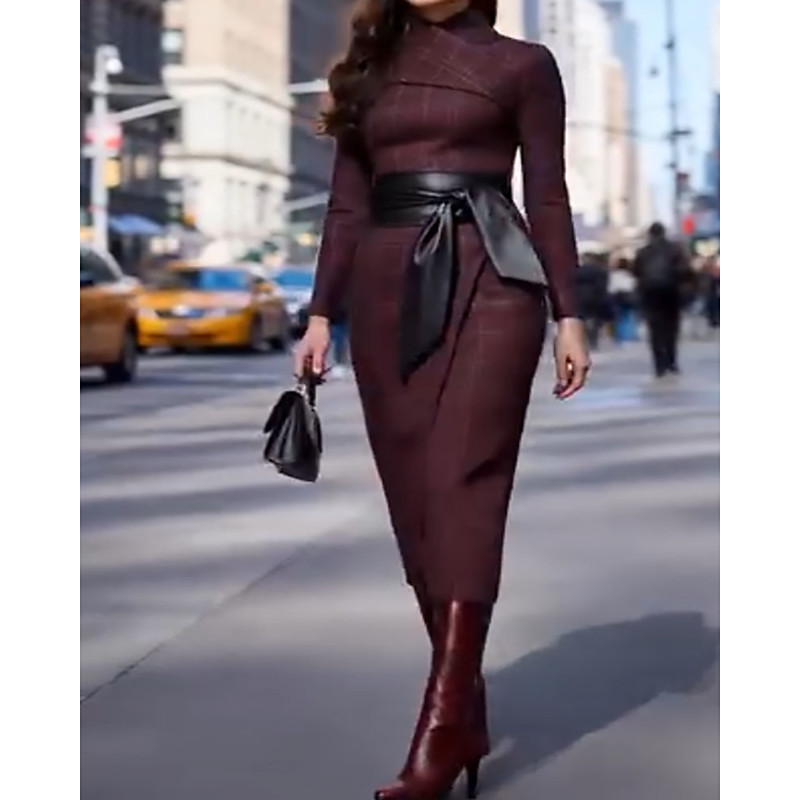 Women's Midi Dress Casual Dress Elegant Fashion Modern Daily Going out Weekend Regular Fit Plaid Long Sleeve High Neck Blue Wine Spring Fall Winter