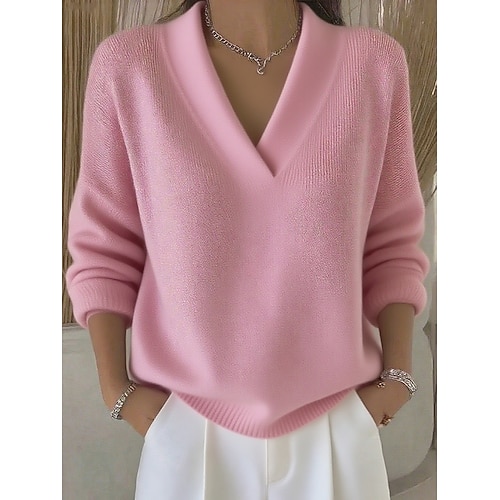 Per donna Felpa Casual Morbido Colore Puro A Coste Scollo a V Lavorato a maglia Manica Lunga Top Regolari Maglia All'aperto Quotidiano Weekend Nero Rosa Autunno Inverno