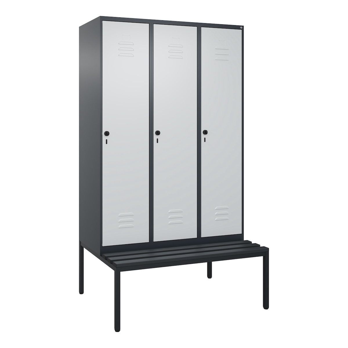 C+P Spind Classic PLUS, Kunststoff untergebaute Sitzbank, 3 Abteile, HxBxT 212x120x82cm, Sicherheitsdrehriegel, Anthrazit/Hellgrau von PROREGAL