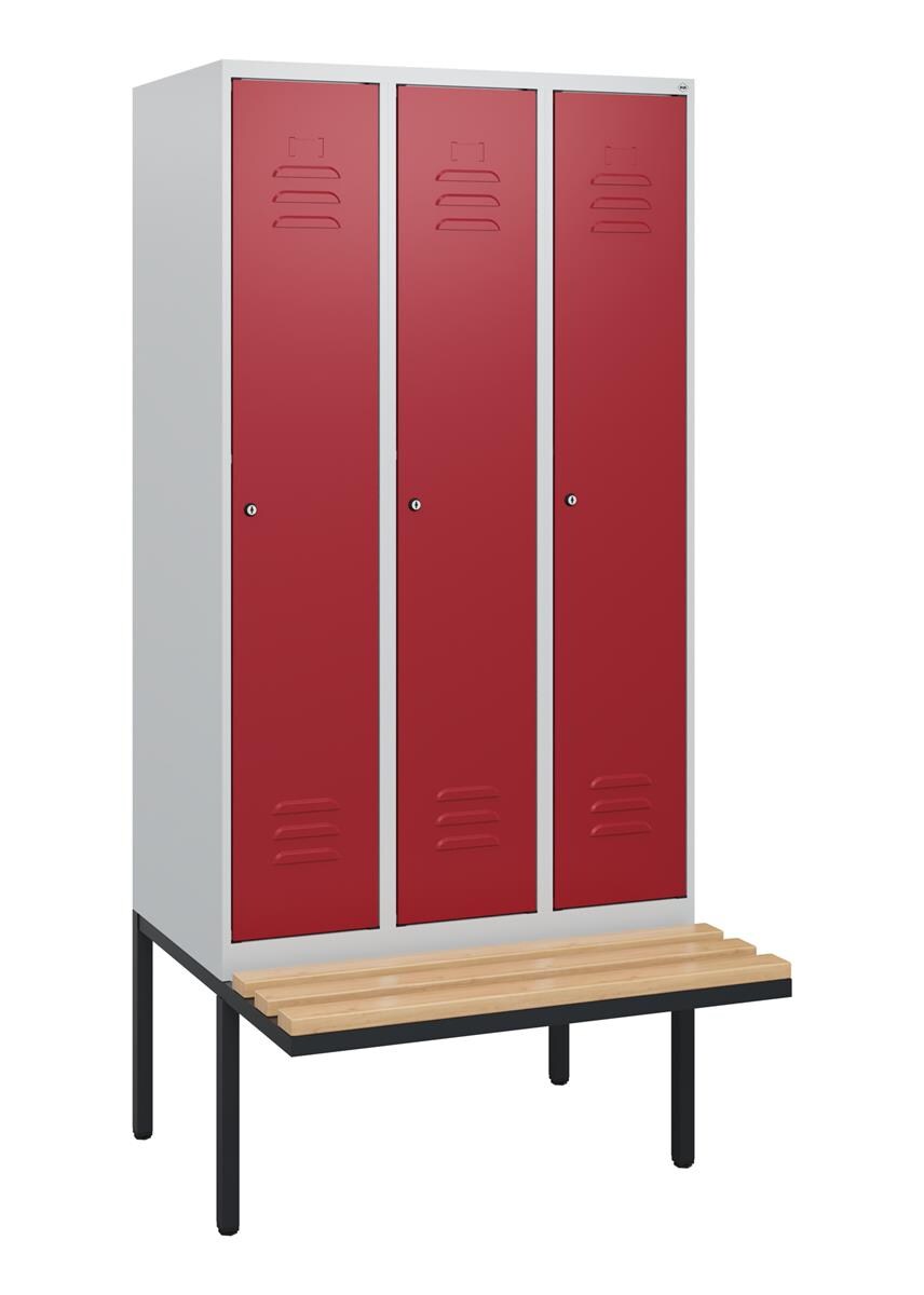 C+P Spind Classic PLUS, schwebender Sitzbank aus Buche 3 Abteile, HxBxT 212x90x82cm, Zylinderschloss, Hellgrau/Enzianblau von PROREGAL