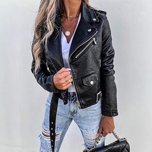 Per donna Giacca in Ecopelle Giacca da Biker Caldo Confortevole Cerniera Bottoni Casual Tinta unica Vacanza Streetwear Casuale Abbigliamento quotidiano Corto Collo ripiegato Vestibilità regolare