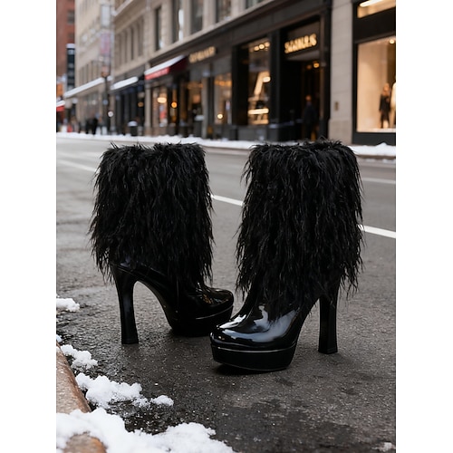 stivali neri da donna con tacco alto e rifiniture in pelliccia sintetica: calzature invernali chic per donne alla moda, ideali per l'uso quotidiano e serale