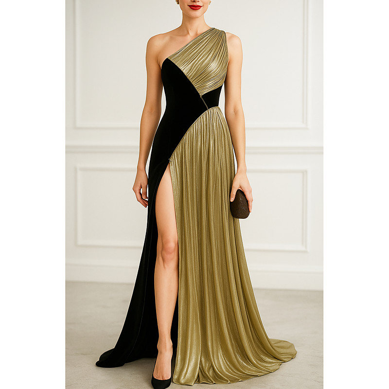 A-Line Floor Length Prom Dresses Evening Gown Ball Gown Formal Dress Elegant Color Block Silky Sleeveless One Shoulder Wedding Formal Velvet with Glitter Pleats