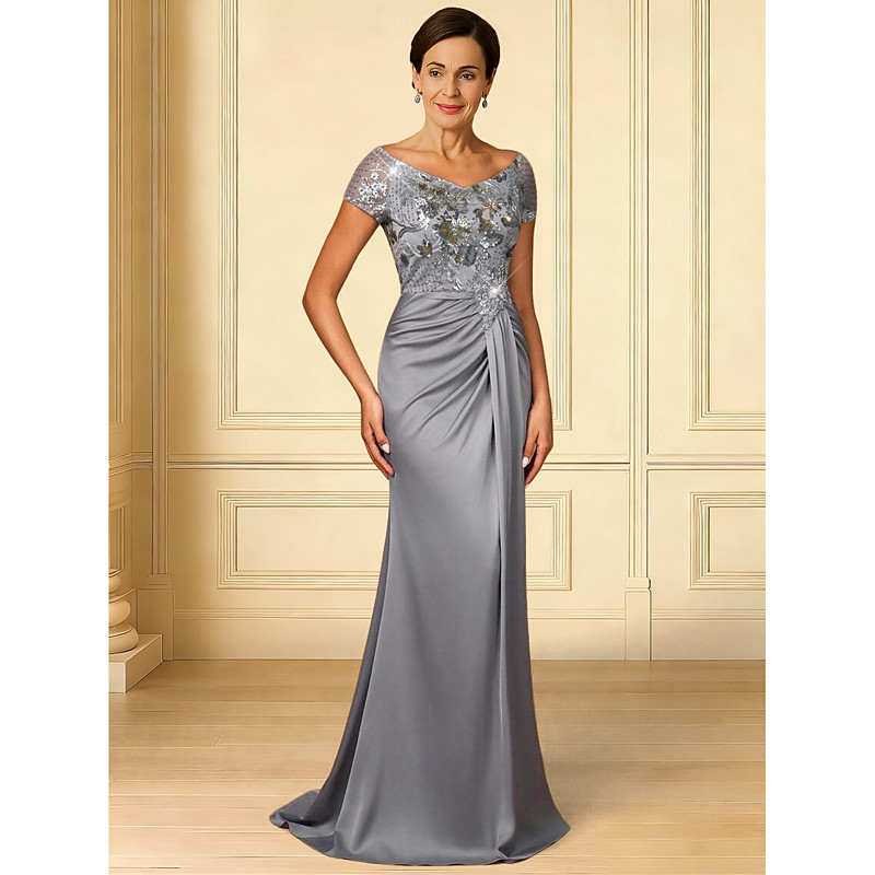 Mermaid Trumpet Court Train Beaded Eembroidered Formal Dresses Mother of the Bride Dress Prom Dresses Evening Gown Ball Gown Formal Dress Elegant Short Sleeve Crew Neck Formal Wedding Guest Satin with