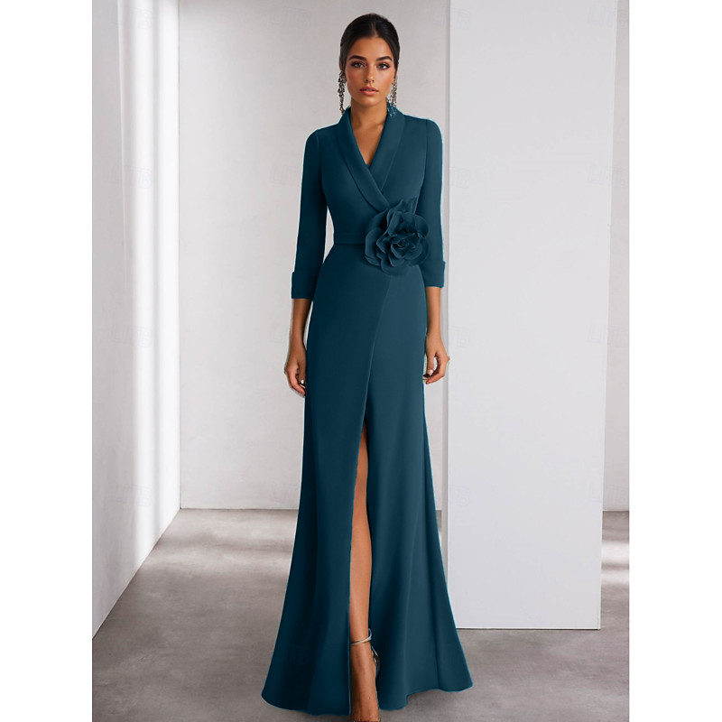 A-Line Floor Length Prom Dresses Evening Gown Ball Gown Formal Dress Elegant High Split Long Sleeve Shirt Collar Wedding Formal Stretch Crepe with Slit Shouder Flower