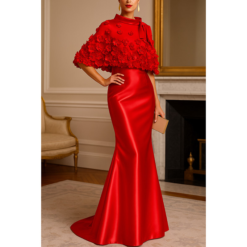 Sheath Column Floor Length Cape Dress Ball Gown with Cape Evening Gown Formal Dress Elegant Celebrity Style Long Sleeve High Neck Wedding Formal Stretch Crepe with Embroidered Flower