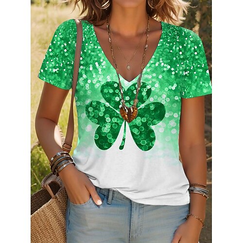 T-shirt da donna di San Patrizio con fiori e trifoglio elegante casual maniche corte collo a V top regolari stampa quotidiana verde estate