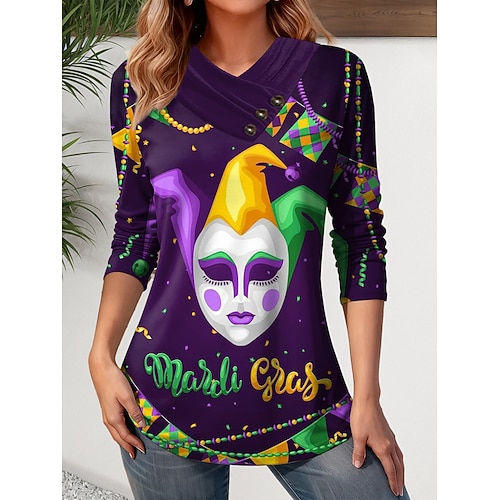 T-shirt da Donna Carnival Grafica Elegante Casual Maniche Lunghe Collo a V Regular Tops Moda Quotidiana Stampa Bottoni Giallo Viola Verde Autunno Inverno