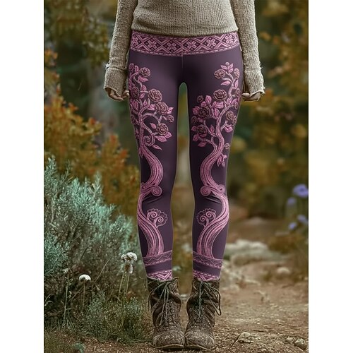 Damen-Leggings im Wikinger-Stil, kuschelig, lässig, für Urlaub und Freizeit, lange Länge, hoher Bund, florales Grafikmuster, bequem, hochelastisch, für Alltag und Outdoor-Aktivitäten, dunkelgrün,