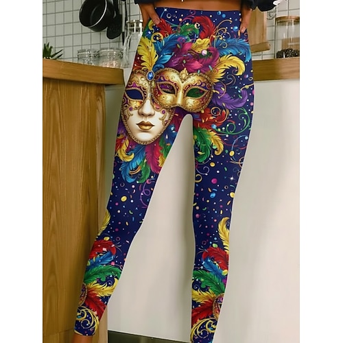 Karnevals-Leggings für Damen, bequeme Leggings im Vintage- und Ethno-Stil, lange Hose mit hohem Bund, Grafikprint, komfortabel, dehnbar, lässig, für Alltag und Urlaub, in Blau, Fuchsia und Lila, ideal