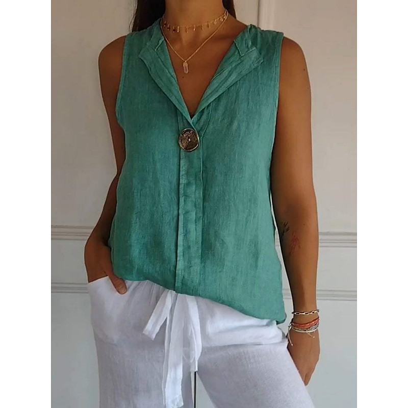 Women's Shirt Blouse Cotton Linen Shirts Plain Stylish Casual Sleeveless V Neck Regular Tops Daily Buttons White Navy Blue Green Khaki Summer