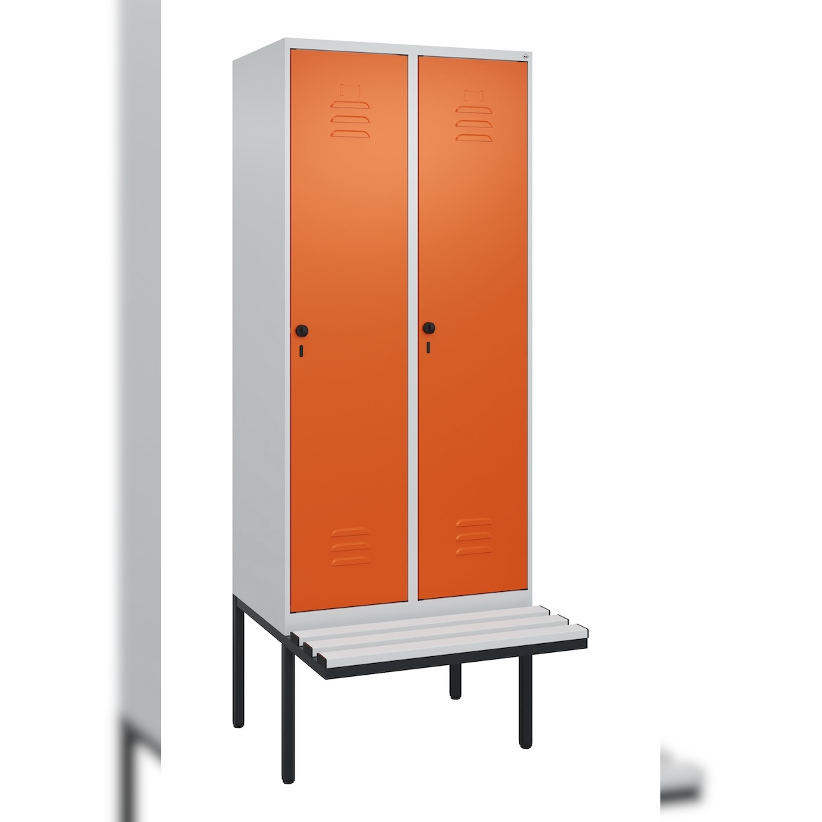 C+P Spind Classic PLUS, Kunststoff schwebende Sitzbank, 2 Abteile, HxBxT 212x80x82cm, Sicherheitsdrehriegel, Hellgrau/Reinorange von PROREGAL