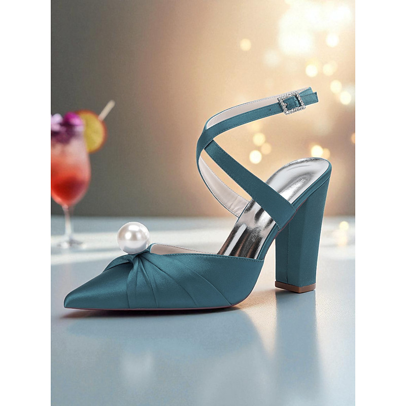 Women's Blue Satin Block Heel Pumps with Pearl Detail and Ankle Strap - Elegant Pointed Toe Shoes for Formal Occasions and Cocktail Parties