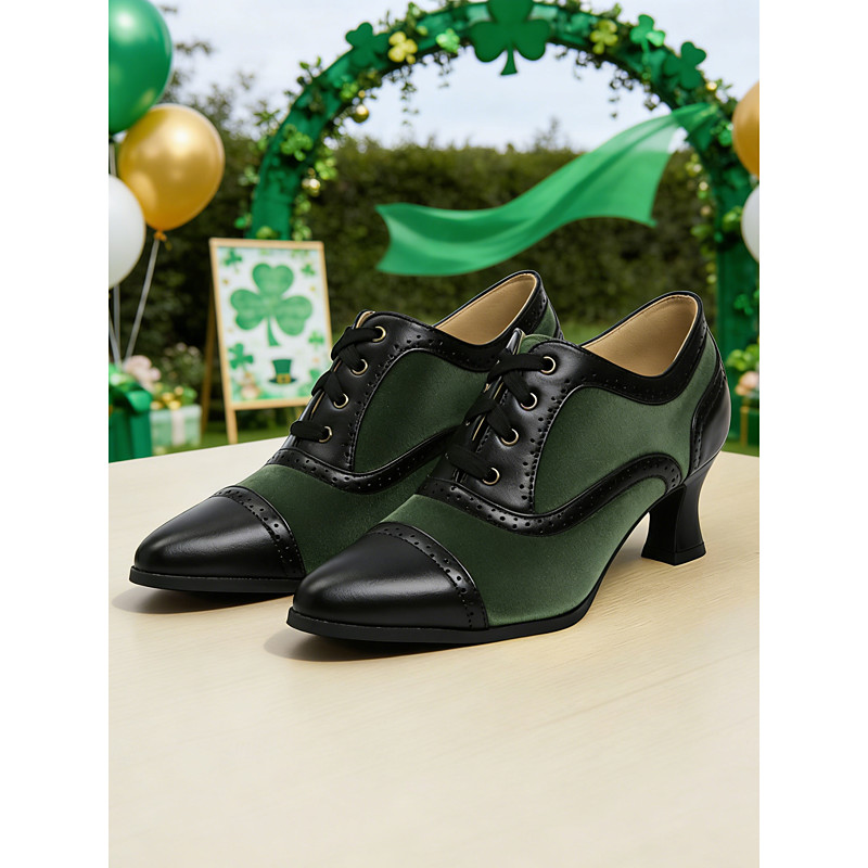 Women's Green and Black Lace-Up Heeled Shoes – Vintage-Inspired Design with Contrast Toe Cap and St. Patrick's Day Style, Perfect for Holiday Festivities and Celebrations