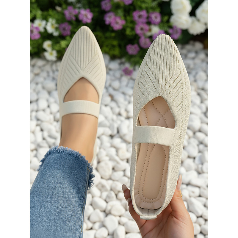 Women's Light Brown Knit Pointed Toe Mary Jane Flats – Breathable Slip-On Shoes with Elastic Strap for Walking, Office Spring Fashion