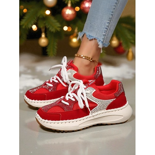 sneakers rosse scintillanti da donna: design elegante in rete e strass, comode per l'uso quotidiano, per le festività, per le riunioni di Natale e per uno stile di vita attivo
