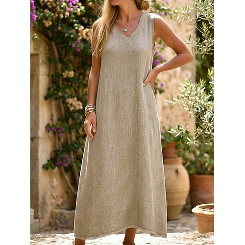 Per donna Abito Midi Finto cotone e lino Abito a Tubino Abito Estivo Casual Quotidiano Vestibilità comoda Semplice Senza Maniche Collo a U Nero Bianco Rosa Estate