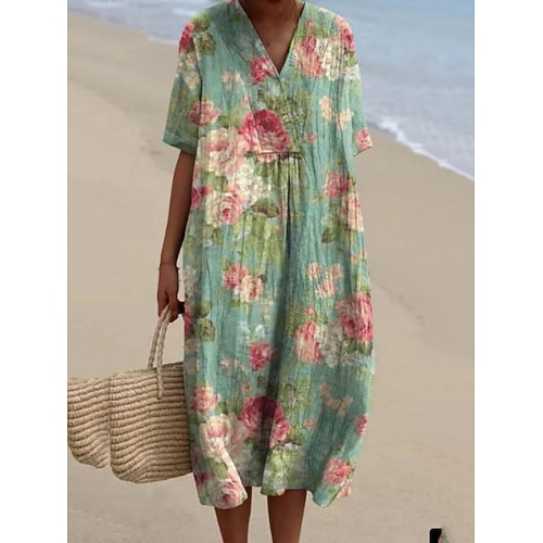 Per donna Abito Midi Abito Floreale Abito Stampato Moda Moderno All'aperto Vacanza Uscire Vestibilità comoda Floreale Manica Corta Scollo a V Blu Verde chiaro Verde militare Rosso Estate Primavera