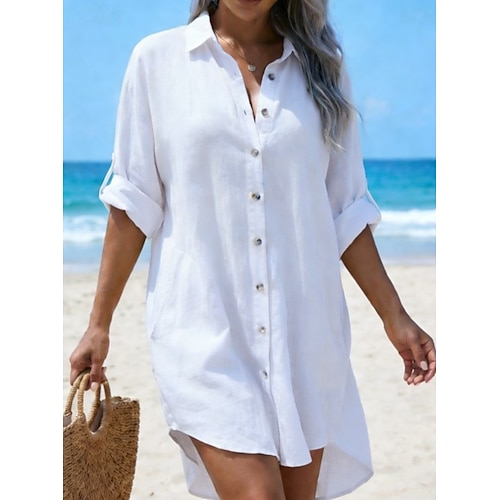 Per donna Abito maxi 100% cotone Abito a Tubino Abito Camicia Abito Bianco Casual Quotidiano Vacanza Vestibilità comoda Semplice Manica 3/4 Scollo a V Nero Bianco Rosa Blu marino Estate Primavera