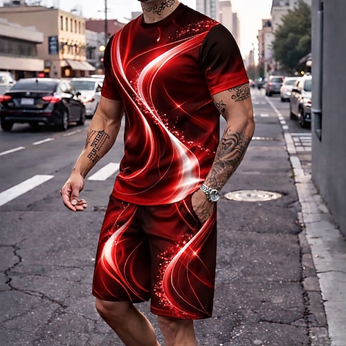 Herren Geometrisch Linie 2St T-Shirts-Sets Sommeroberteile Kurzarm Kurze Hosen Rundhalsausschnitt Alltagstauglich Urlaub Ausgehen 3D-Druck Sommer Blau Schwarz Rote