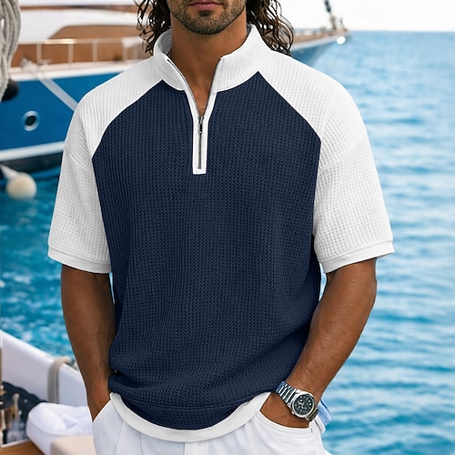 Per uomo Magliette Polo a Nido d'Ape Testurizzato Casuale Vacanza Colletto Mao Manica Corta Essenziale Confortevole Blocco di colori Blocco di colore Bottoni Primavera Estate Blu Nero Blu marino