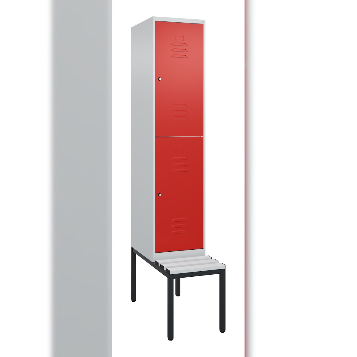 C+P Spind Classic PLUS, Kunststoff untergebaute Sitzbank, 2 Abteile, HxBxT 212x40x82cm, Zylinderschloss, Hellgrau/Rot von PROREGAL