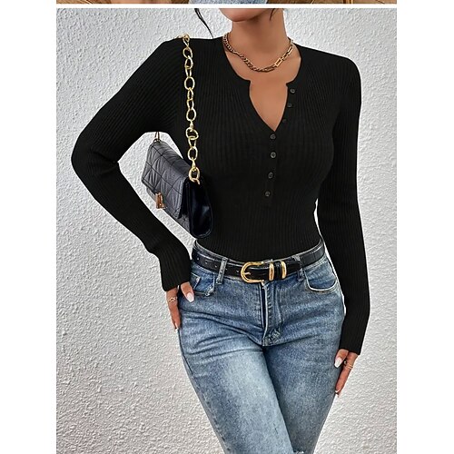 Per donna Felpa Casual Morbido Colore Puro A Coste Girocollo Bottoni Lavorato a maglia Manica Lunga Top Regolari Maglia All'aperto Quotidiano Weekend Nero Vino Autunno Inverno