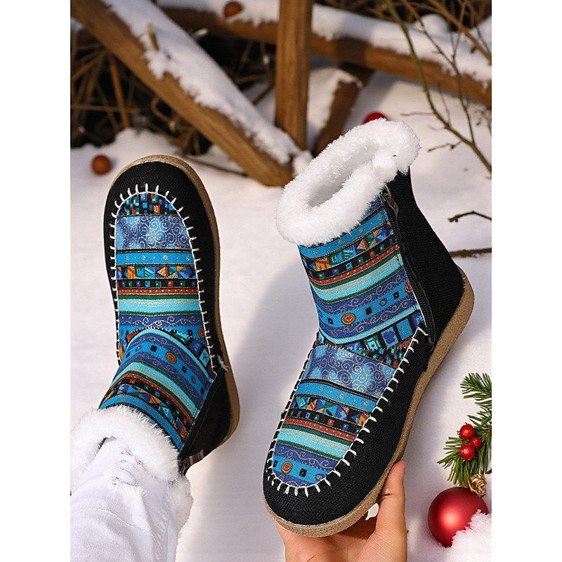 Women's Ethnic Pattern Warm Ankle Boots – Colorful Boho Style Fleece Lined Winter Boots with Side Zipper, Cozy Outdoor Footwear for Travel and Holiday