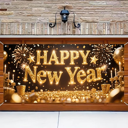 Capodanno arazzo Copertura per porta del garage Grande appeso Buon anno 2026 Fuochi d'artificio Carino 3D Da serata All'aperto Vacanze Sfondi di ripresa Yarda Arredamento per la casa