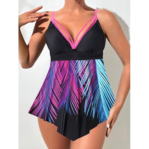 Tankini da donna in 2 pezzi costume da bagno con controllo pancia a vita alta senza schienale abbigliamento da spiaggia per vacanze grafica a blocchi di colore scollo a V senza maniche