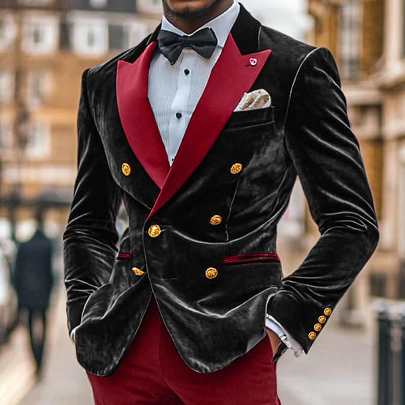 Men's Blazer Jacket Tuxedo Closure collar Vintage Party Velvet Patchwork Solid Colored Blazer Black Burgundy Dark Blue Standard Fit Double Breasted Six-buttons