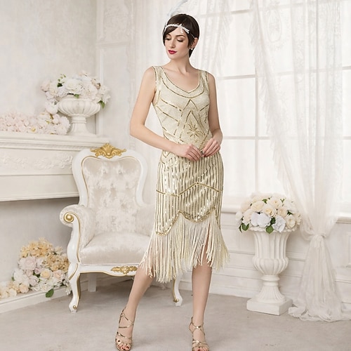Anni Ruggenti Anni 1920 Abito vintage Lunghezza al ginocchio Abito Flapper Vestito Abito da cocktail Senza maniche Il grande Gatsby Invitato al matrimonio Paillettes Scollo a V Costume Per donna