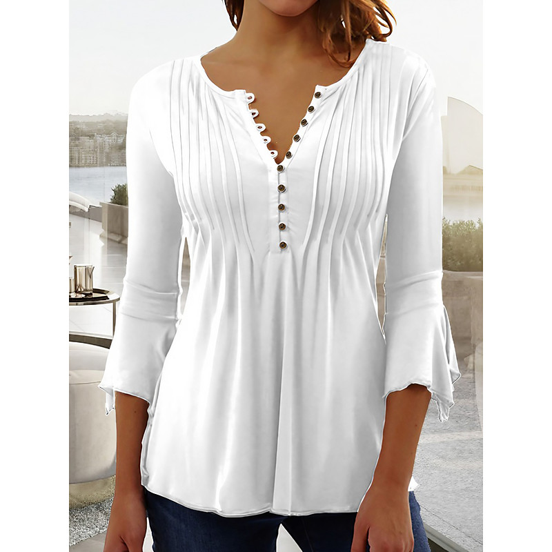 Women's Blouse Solid Color Plain Elegant Bohemia Stylish 3/4 Length Sleeve Ruffle Sleeve V Neck Regular Tops Work Daily Holiday Ruched Ruffle Buttons Black White Wine Red Summer Spring Fall