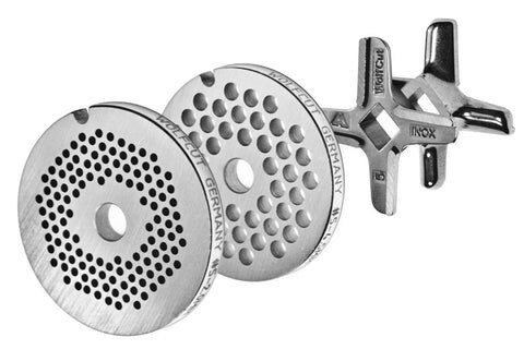 WOLFCUT Fleischwolfscheibensatz 2 mm + 4,5 mm Bohrung und ein Kreuzmesser Eversharp kompatibel mit allen gängigen Fleischwolf Marken Größe 5