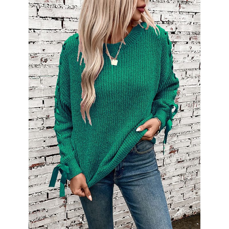 Women's Sweater Casual Soft Pure Color Ribbed Crew Neck Patchwork Knitted Long Sleeve Regular Tops Knit Outdoor Daily Weekend Pink Wine Fall Winter
