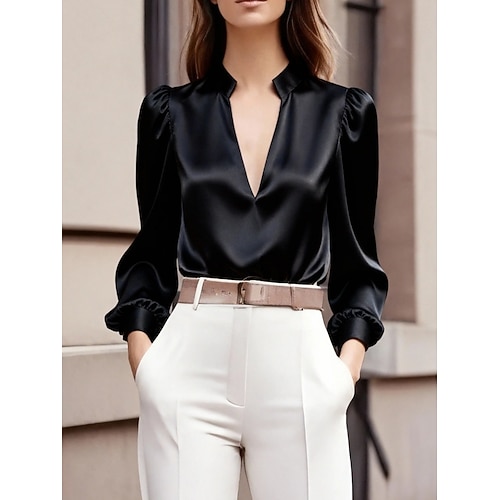 camicetta da donna in raso tinta unita elegante casual manica lunga scollo a V top normali ufficio lavoro nero bianco rosa primavera autunno