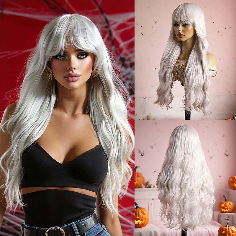 Synthetic Wig Body Wave Wavy Middle Part Neat Bang Wig 26 inch White Synthetic Hair 26 inch Women's Soft Comfy White