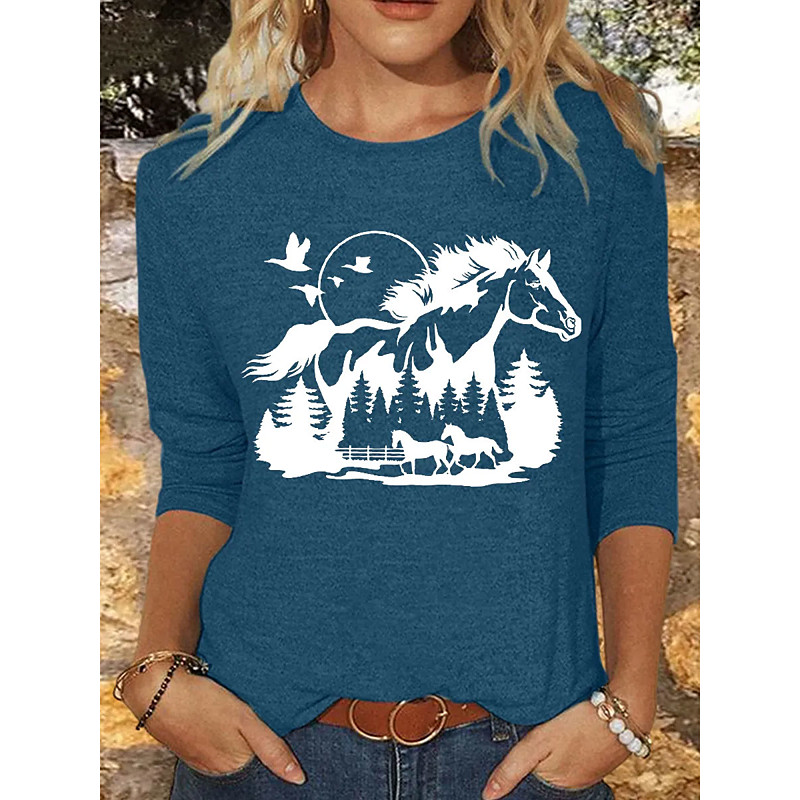 Women's T Shirt Graphic Animal Horse Vintage Stylish Classic Long Sleeve Crew Neck Round Neck Regular Tops Daily Print Blue Pink Khaki Gray Spring Fall Winter