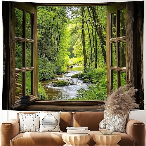 Arazzo con vista della finestra in 3D, paesaggio con fiume e foresta, alberi verdi, natura, arazzo da parete per soggiorno, arredamento per la casa, sfondo per poster in tessuto.