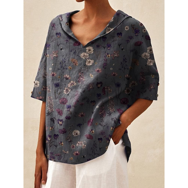 Women's Cotton Linen Shirts Solid Color Plain Elegant Bohemia Vintage Half Sleeve Hooded Crop Tops Dark gray-gold leaf flowers Flowers - Dark Light green - morning glory Golden Flower - Gray Summer